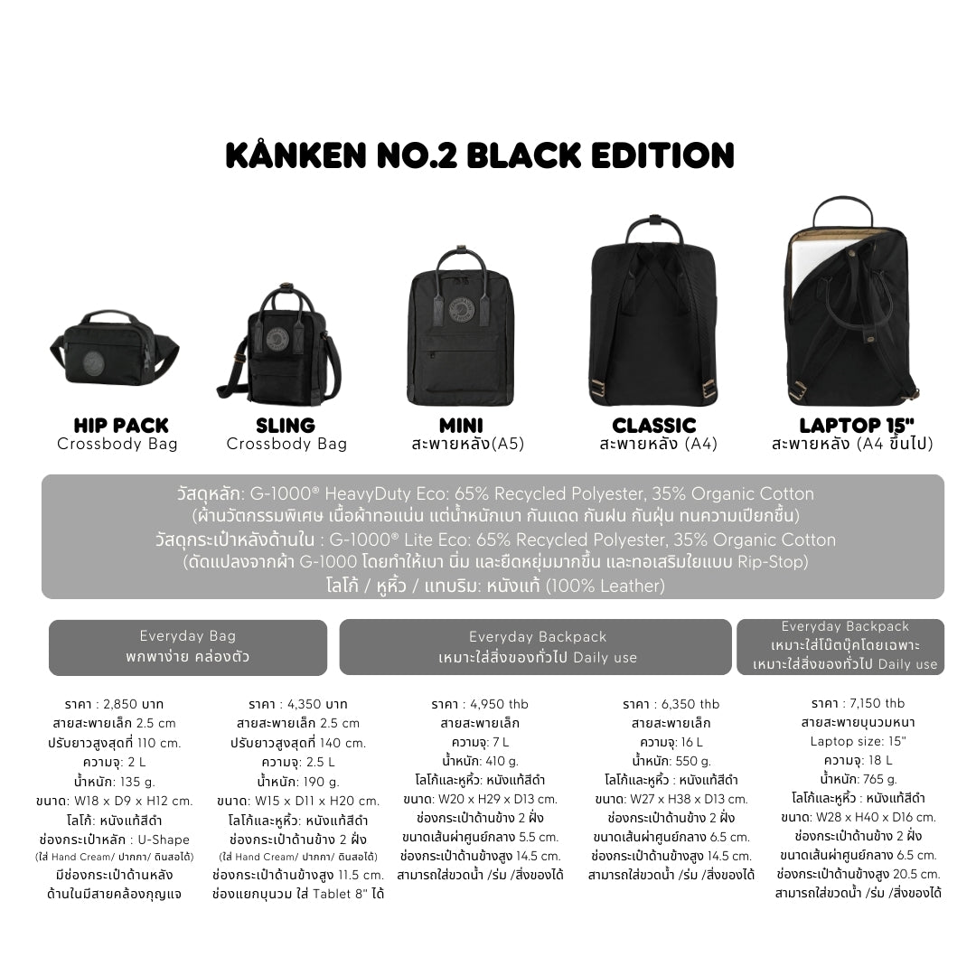 รุ่นพิเศษสีดำสนิท Kanken No.2 Black Edition ที่ทางแบรนด์ Fjällräven ได้ออกแบบต่อยอดออกมาจากรุ่น Kanken โดยให้มีดีไซน์เฉพาะตัว แถมถูกหลักสรีศาสตร์ เพิ่มลูกเล่นที่หูหิ้ว โลโก้ และแถบริมด้านล่างทำจากหนังแท้สีดำ ทนทานด้วยผ้า G1000 นวัตกรรมผ้าที่โด่งดังของแบรนด์ เนื้อผ้าที่ถูกใช้ผลิตเป้แบ็คแพ็คเดินป่าของเรา นอกจากความเเข็งแรงแล้วนั้น สไตล์ของกระเป๋า ยังสามารถใช้ได้ทุกโอกาส ไม่ว่าจะสะพายหลังใช้ไปทำงาน หรือใช้ในชีวิตประจำวัน นอกจากนี้ยังใช้เป็นเป้สะพายหลังเดินทางท่องเที่ยว เป็นเป้ที่ใช้ได้ตลอดกาล