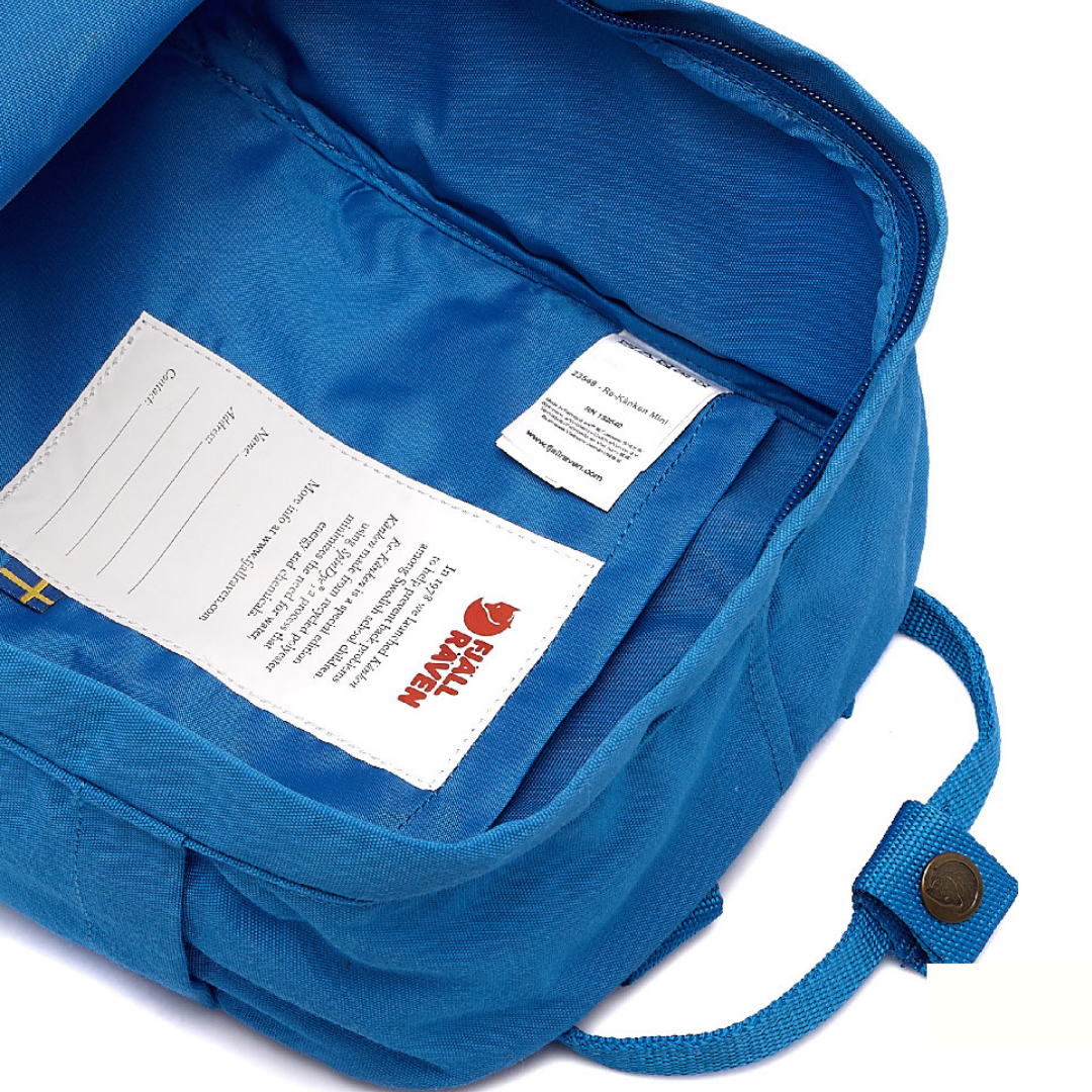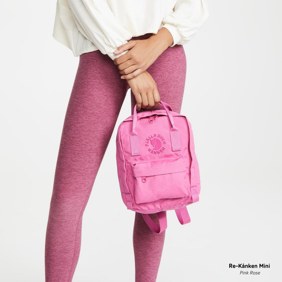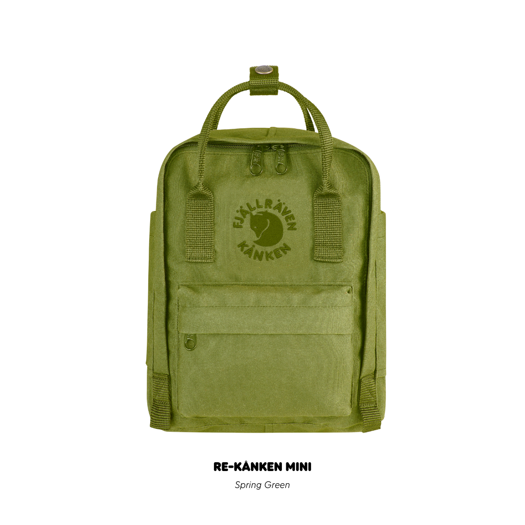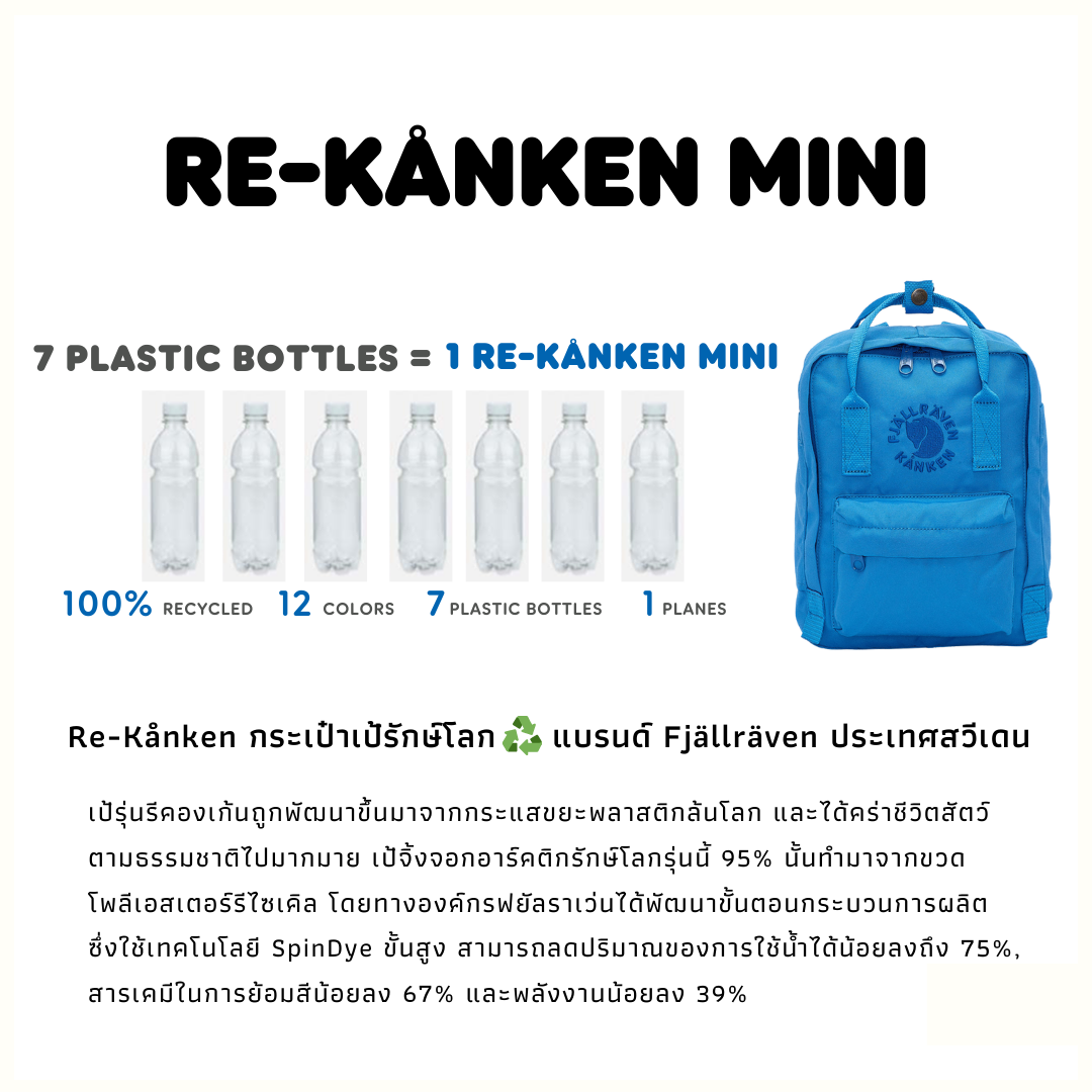 Fjallraven Re-Kanken Mini กระเป๋าเป้สะพายหลังขนาดเล็ก ขนาดกะทัดรัด วัสดุหลักเป็นผ้าโพลีเอสเตอร์ ที่ทำจากขวดพลาสติกรีไซเคิล (PET) (กระเป๋า 1 ใบจะใช้ขวดพลาสติกประมาณ 9ใบ) ใช้กระบวนการ Spin-Dye ในการย้อมสี ที่สดใส ไม่มีซีดจาง