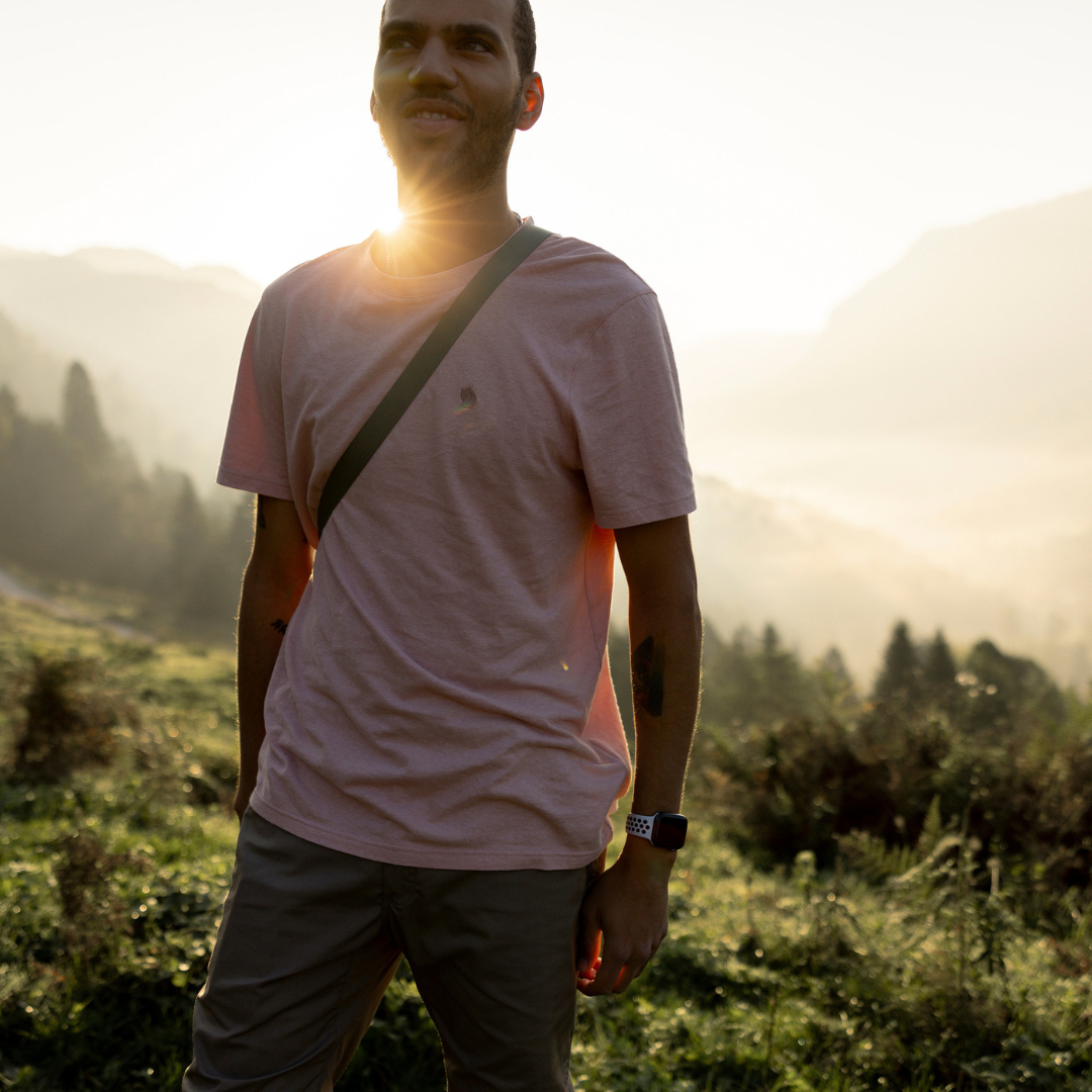 เสื้อยืดแขนสั้นสำหรับผู้ชายที่มีน้ำหนักเบาและสวมใส่สบาย ทำจากผ้าเจอร์ซี่ผสมกัญชงและผ้าฝ้ายออร์แกนิก เสื้อ Hemp Blend T-shirt M ผลิตจากผ้าที่มีผิวสัมผัสเล็กน้อยและมีการตกลงที่ดี โดยตะเข็บไหล่ถูกย้ายไปด้านหลังเพื่อลดความเสี่ยงในการเสียดสีเมื่อสวมใส่เป้สะพายหลัง คอกลมและมีโลโก้ปักเล็กๆ ที่หน้าอก