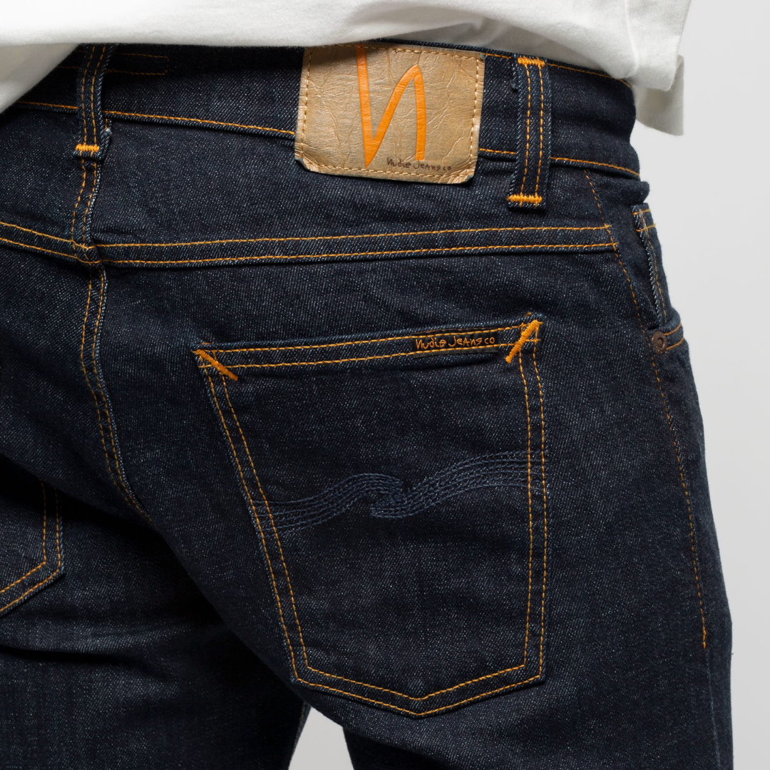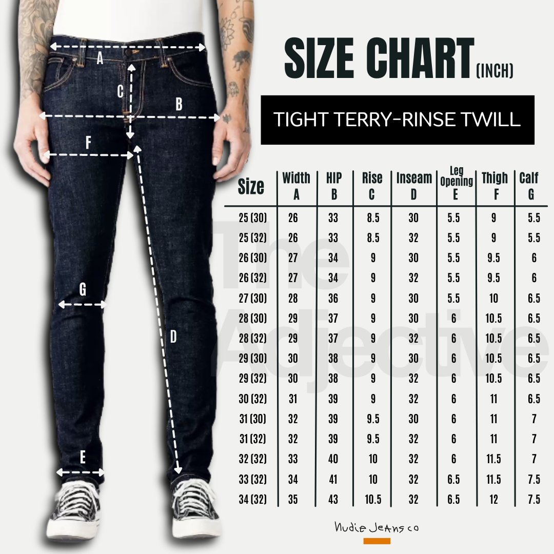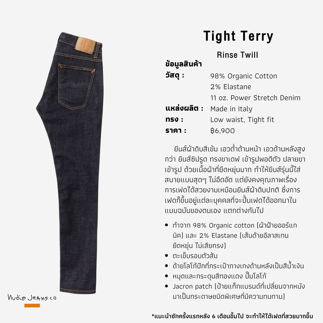กางเกงยีนส์ Nudie Jeans ทรง Tight Terry ทรงจะเป็นยีนส์ขาเดฟ ทรงพอดีตัวตั้งแต่สะโพกจรดข้อเท้า เอวต่ำพร้อมซิปรูดด้านหน้า มีความพิเศษที่เอวด้านหลังจะทำให้มีความสูงมากกว่าด้านหน้า (แต่ใส่ก็จะไม่ได้รู้สึกว่าสูงนะ จะพอดีกับสรีระคุณผู้ชายที่มีพุงด้านหน้า) ทำให้เวลานั่งย่อลงไป หรือก้ม จะไม่เห็นร่องก้น ไม่โป้