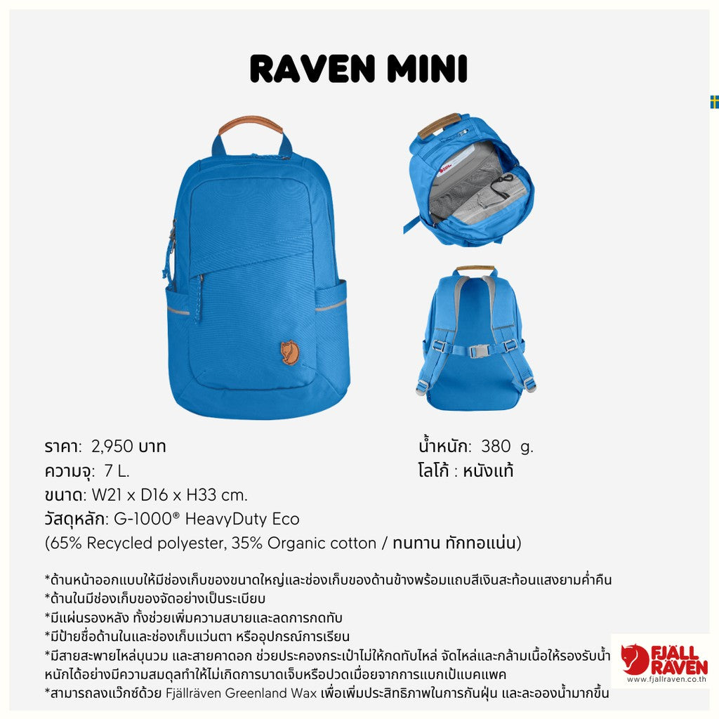 Raven Mini เป้แบ็คแพ็คสำหรับเด็ก กระเป๋าเป้สะพายหลังเด็กดีไซส์เรียบง่าย กระเป๋าแบรนด์ Fjallraven จากสวีเดน กระเป๋าแฟชั่น เด็กผู้หญิง เด็กผู้ชาย เป้แบ็คแพ็คสำหรับเด็กที่เป็นได้ทั้งเป้เดินทางพร้อมผจญภัย ทำจากผ้า G-1000 Heavy Duty Eco นวัตกรรมผ้าที่โด่งดังที่สุดของแบรนด์ฟยัลราเว่น ทอแน่น ทนทาน กันน้ำ กระเป๋าเด็กที่สะพายหลังที่ได้ทั้งบุ๋น และบู๊ ใส่ของจุใจ พร้อมลุยทุกที่.